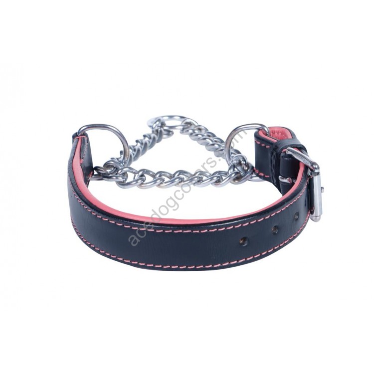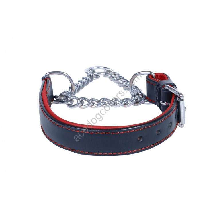 This Ace Adjustable Half Check Collar is made with grade one leather and completed with an adjustable solid steel chain. The collar is also fully padded and lined for the comfort and protection of your dogs fur and skin. Hard wearing due to the anti-run twin needle method used. Every Ace leather collar is individually hand-cut, hand-stitched and hand-made using traditional methods.